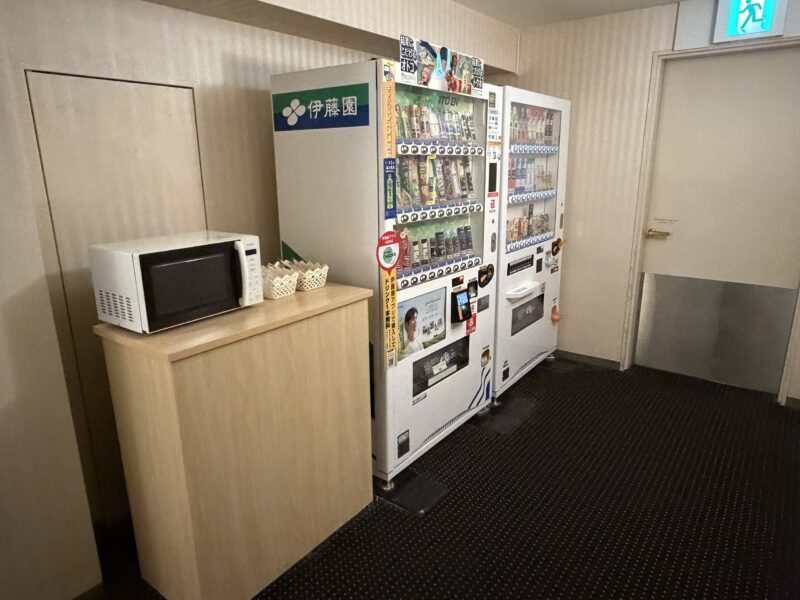 飲料の自販機が2台と電子レンジが共用スペースにあります。(たぶん各階に)