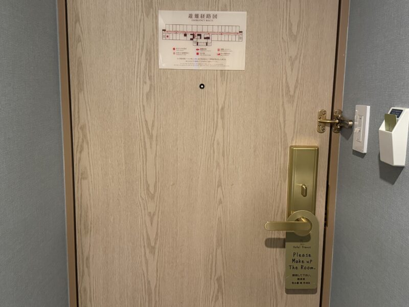 ドアの裏には避難経路図が貼ってあり、ドアノブにはプレートがかかっていました。
