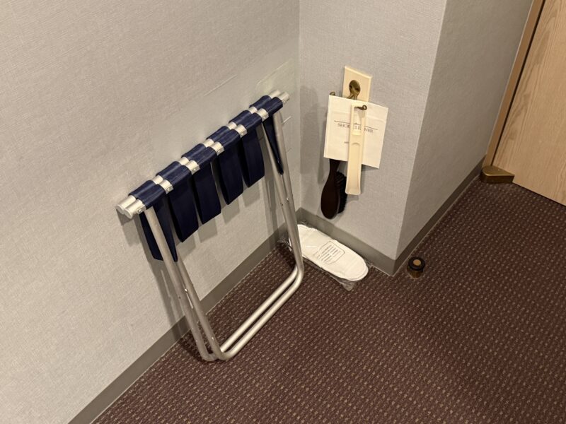 下には折り畳み式のバゲージラック、使い捨てスリッパ、靴ベラ、靴ブラシなど。