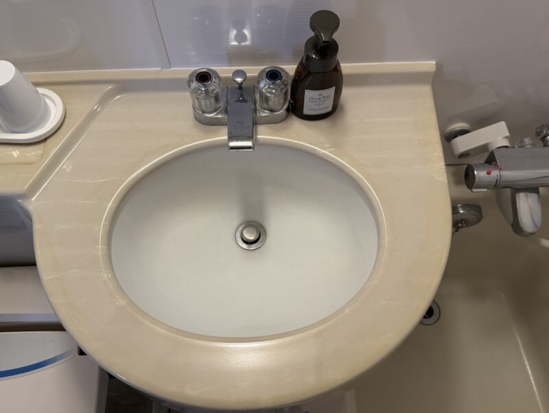 蛇口は温冷別のハンドル式で、やや年季を感じる仕様。