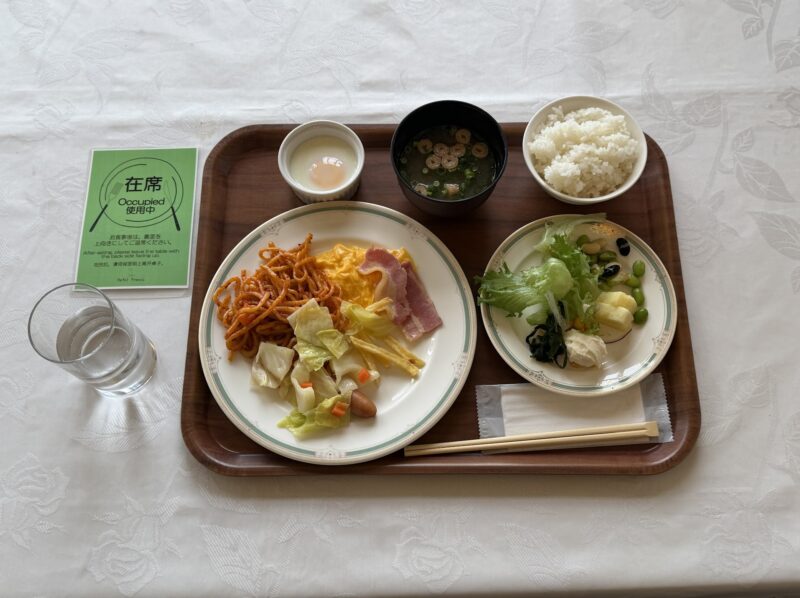 焼きそば、スクランブルエッグ、ハム、ウインナー、キャベツ炒めといった定番の洋食系おかずに加え、サラダ、ご飯、温泉卵、味噌汁と和洋どちらも揃った充実の内容です。