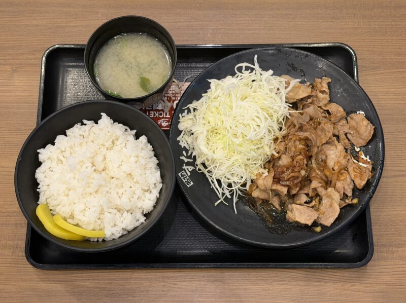 たっぷりのキャベツと豚肉の生姜焼きに、ご飯と味噌汁がついたボリューム満点の一皿で、試合前にしっかりエネルギーを補給できました。
