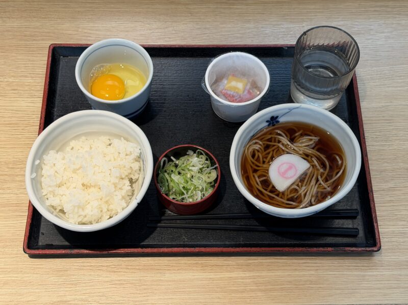 かけそば、ご飯、生卵、漬物とシンプルな構成ですが、朝からしっかり食べられる満足感があります。490円というコスパの良さも魅力で、試合観戦前の朝食として重宝しました。