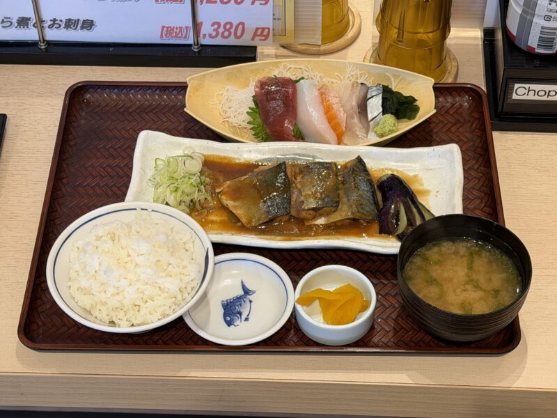 注文したのはサバの味噌煮とお刺身の定食(1,380円)。