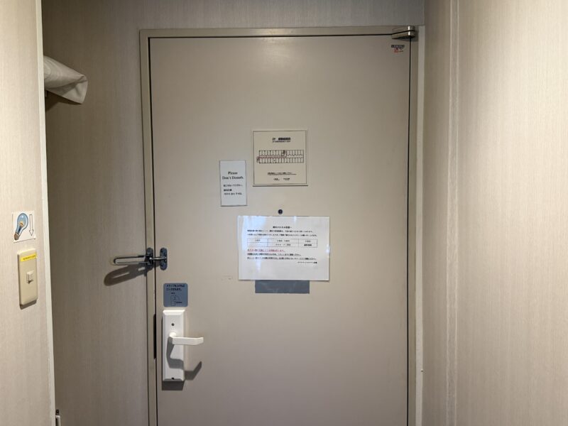 ドアの裏側には避難経路図、客室ドアプレート、あとは連泊客向けの清掃、タオル交換、ゴミ出しの方法が書かれた案内が貼られていました。