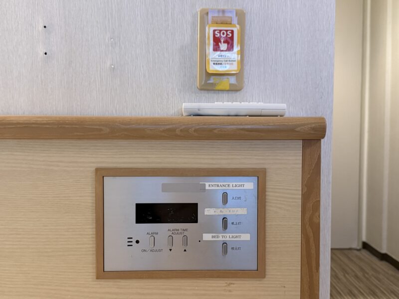 設備はやや年季を感じますが、枕元には照明スイッチとアラーム付きのコントロールパネルが設置されています。
