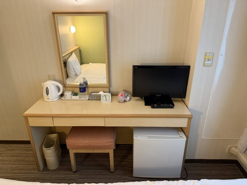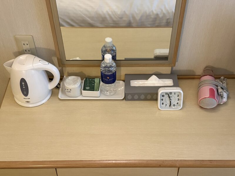客室の紹介は以上ですが、冷蔵庫、テレビ、電気ケトルなど基本設備は揃っていて、滞在に困る場面はありませんでした。