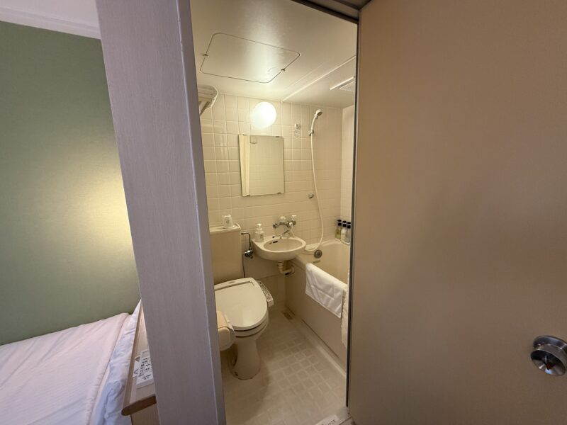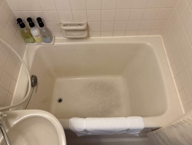 浴槽はビジネスホテルの中では比較的ゆとりのあるサイズ感で、足を完全に伸ばせるほどではないものの、窮屈さはそこまで強くありません。