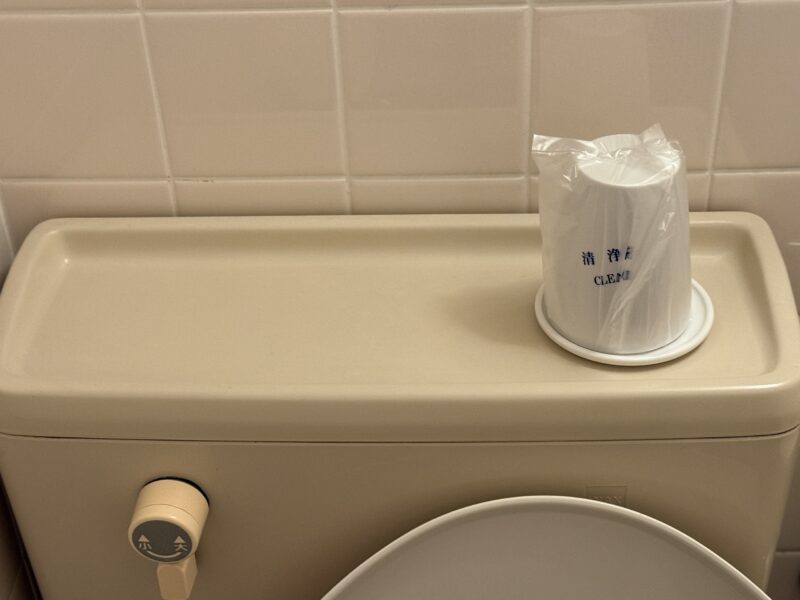 トイレには「清潔済」と表示されたコップが用意されていました。