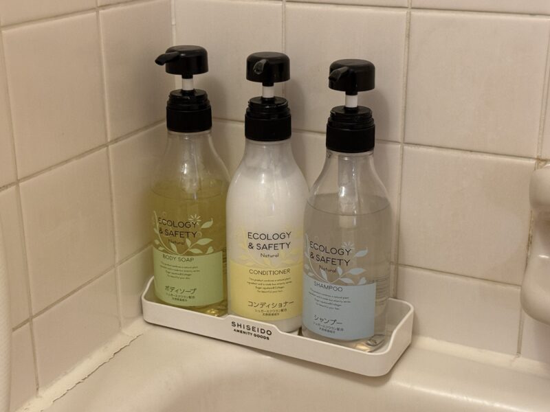 シャンプー・コンディショナー・ボディソープは「ECOLOGY & SAFETY」というシリーズで、ビジネスホテルとしては標準的な仕様です。