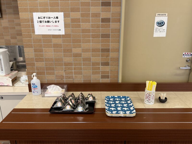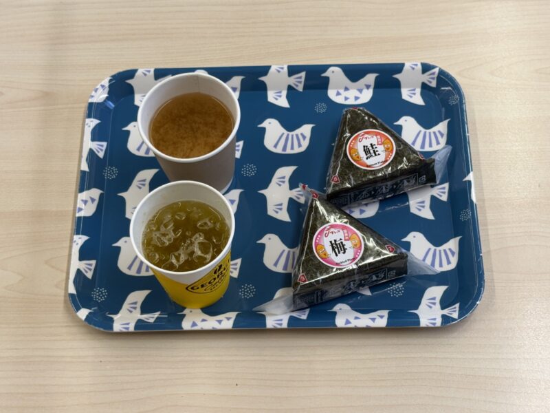 内容はおにぎり2個、インスタントの味噌汁、ドリンク1杯というシンプルな構成で、おにぎりの代わりにパンの日もあるようです。
