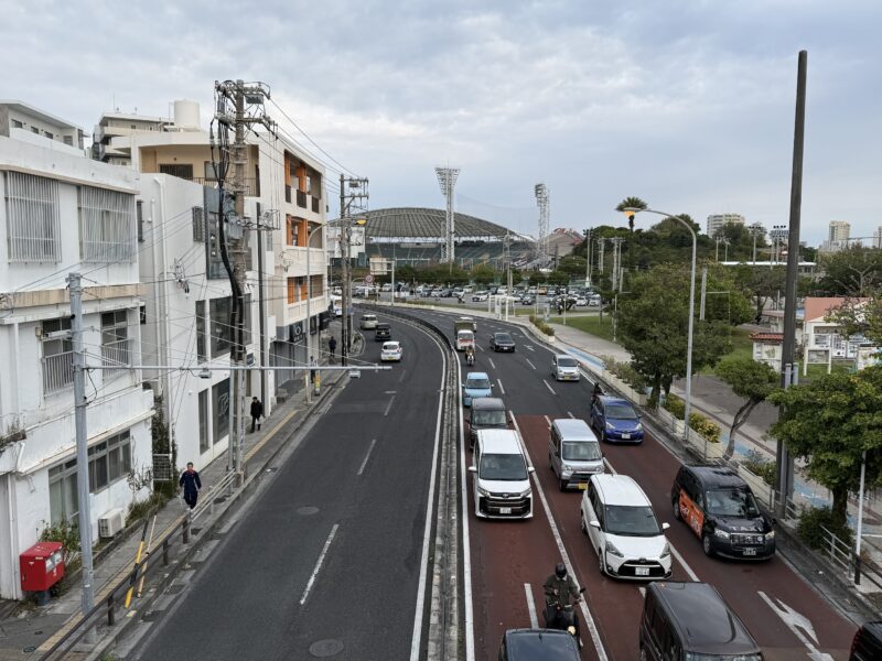客室の窓からはホテル前の大通りと、セルラースタジアム那覇の室内練習場の建物が見えます。