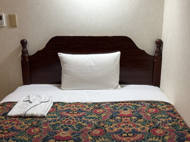 ベッドはセミダブルサイズ(135cm幅)で、寝心地は適度な硬さでした。