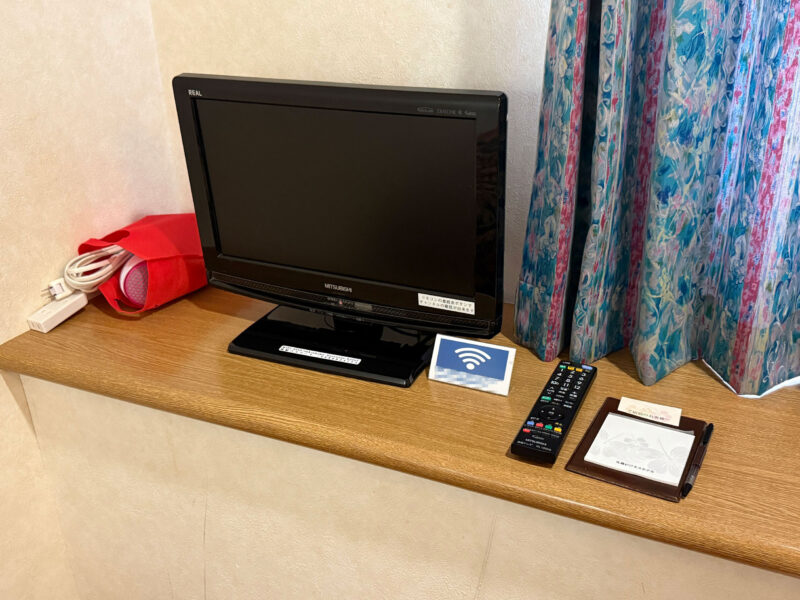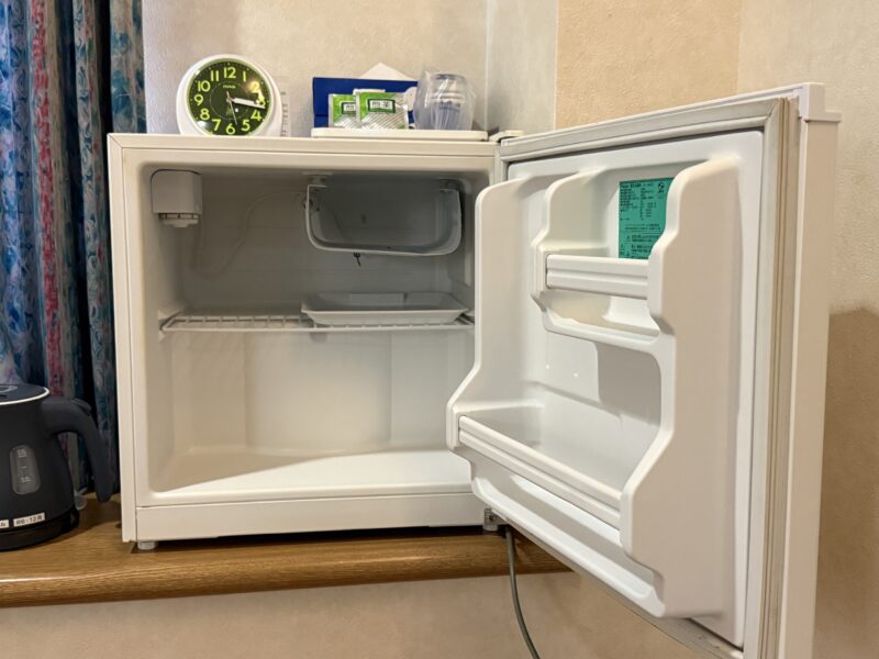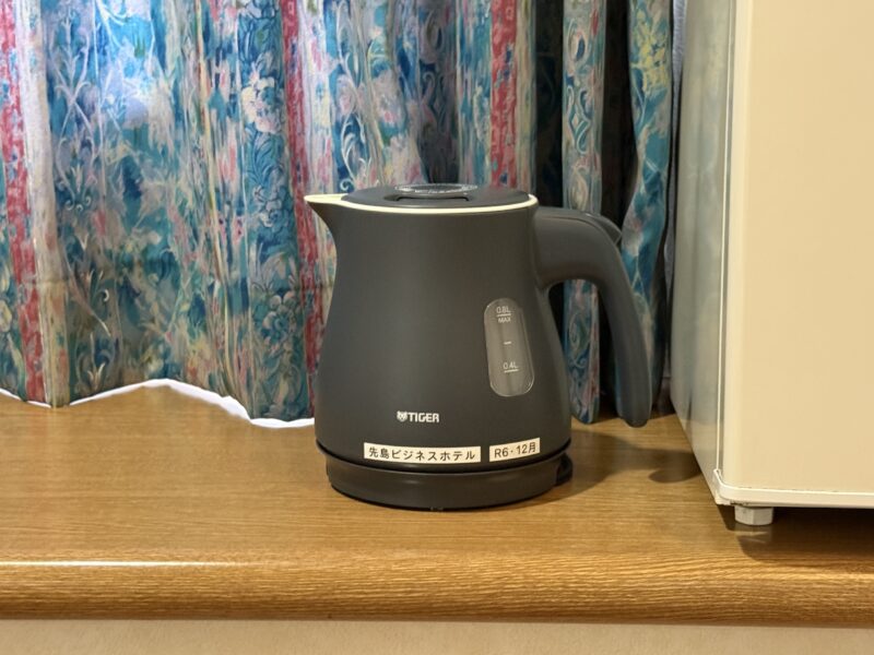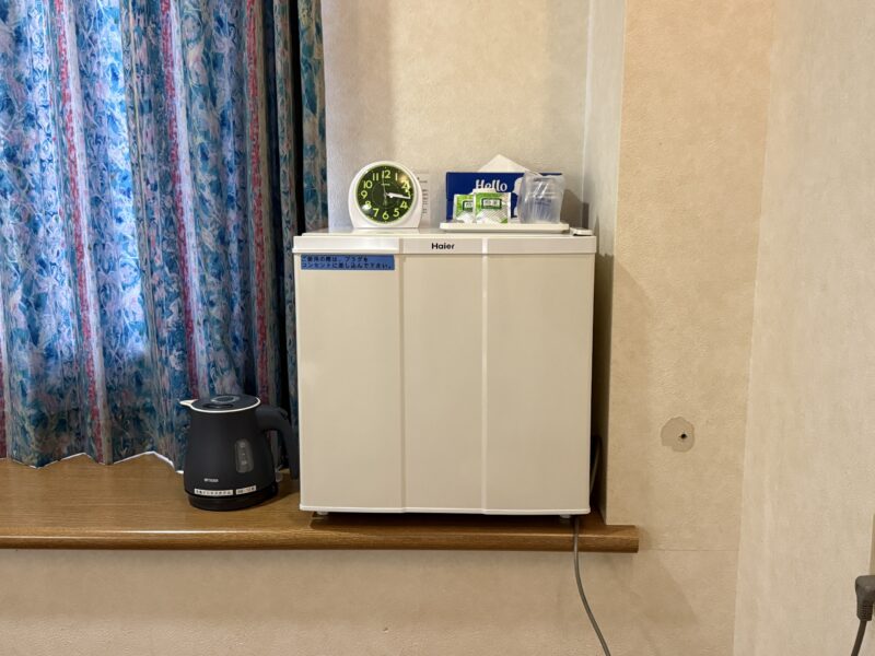 部屋の設備は、テレビ、湯沸かしケトル、冷蔵庫など、ビジネスホテルとして基本的なアイテムがそろっています。