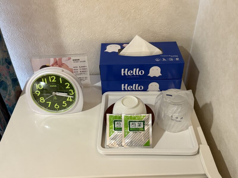 お湯を沸かして煎茶を飲むことができますが、ミネラルウォーターはなかったです。