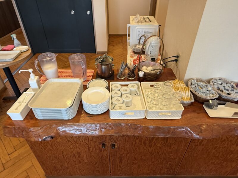 内容はパン、ゆで卵、ホットコーヒー、牛乳というシンプルな軽食スタイルで、必要なものをさっと食べられる手軽さがありました。