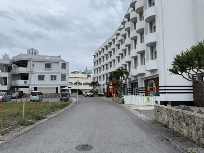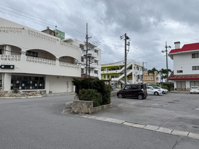 ここを右に曲がると、奥に見えるオレンジ色の建物が先島ビジネスホテルです。周りは静かな環境で、リーズナブルなホテルが他にも何件が建っています。
