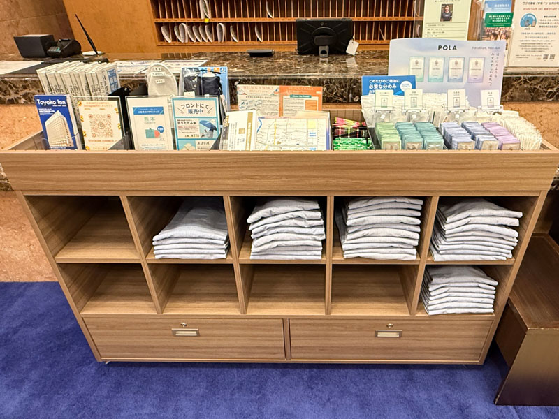 アメニティは歯ブラシセットは客室に用意されていますが、その他はフロント前のアメニティコーナーから必要な分を持っていくスタイル。