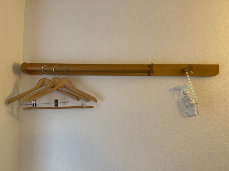 右側にはハンガーラックがあり、ハンガー3本と除菌スプレーがかかっていました。