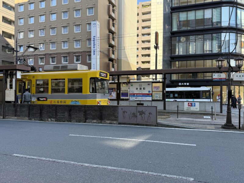 最寄りは熊本市電の「水道町」電停で、ホテルは電停の目の前です。
