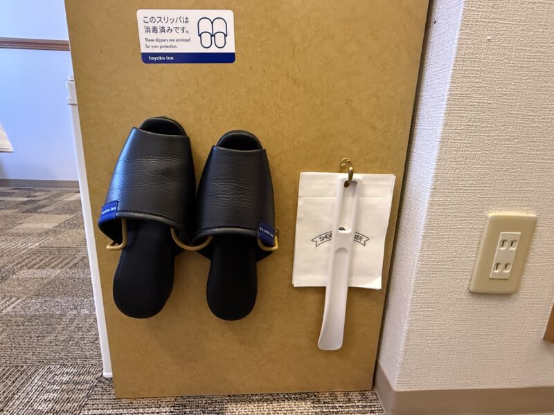 デスクの側面には靴ベラとスリッパが掛けられていて、その横にもコンセントがあります。