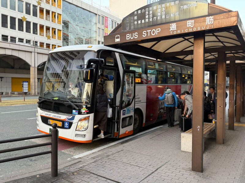 熊本空港からは空港リムジンバスを利用し、「通町筋」バス停で下車して、そこからホテルまでは徒歩で移動しております。