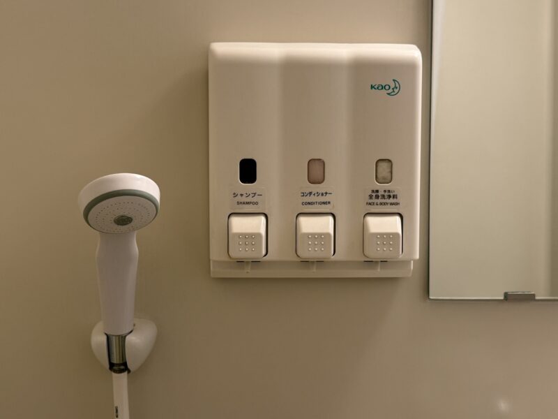 シャンプー、コンディショナー、ボディソープはビジネスホテルでよくある壁に固定された、Kao(花王)製のアメニティディスペンサー。
