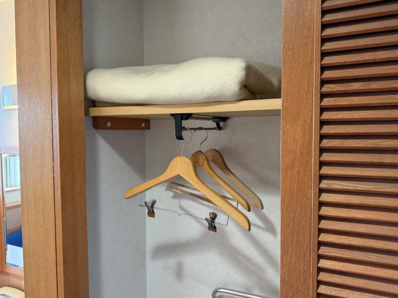 右手にはクローゼットがあり、上段に毛布、下にはハンガーが3本かかっていました。