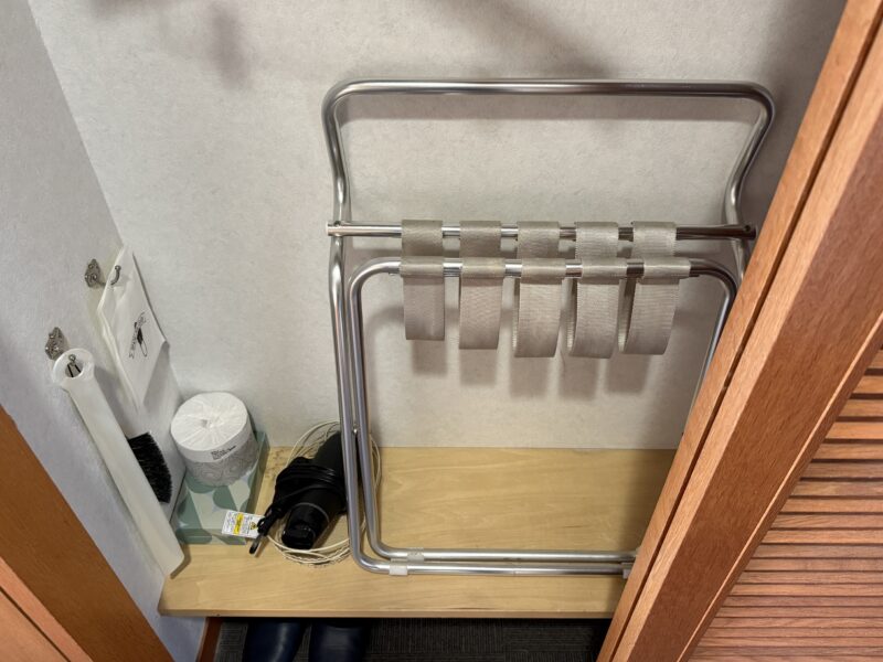 さらに下を見ると、バゲージラック、ヘアドライヤー、靴ベラ、靴ブラシ、予備のボックスティッシュとトイレットペーパー。