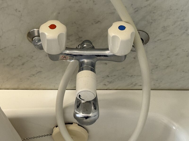 蛇口は冷水と温水を手動で調節する面倒なタイプ。