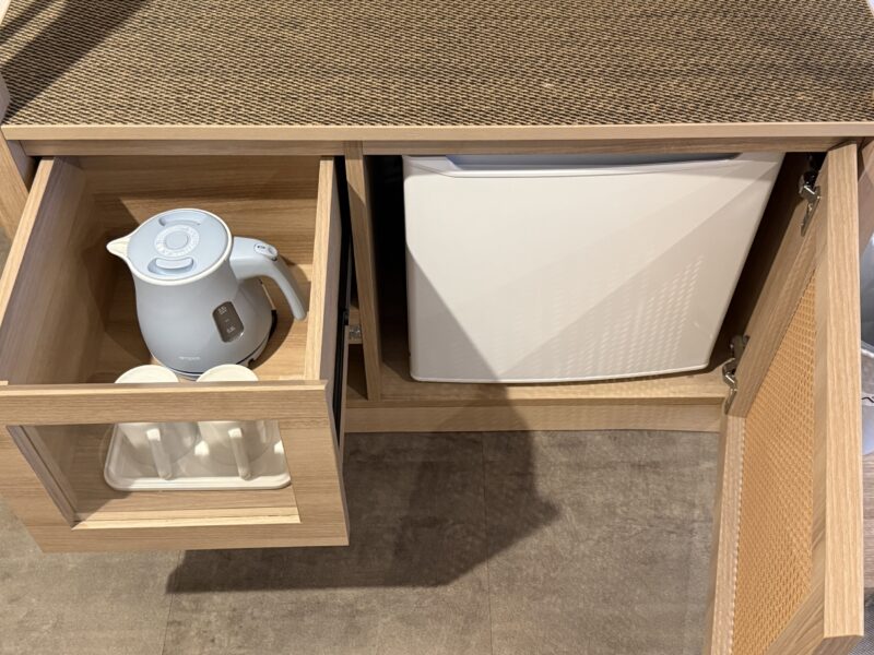 必要な設備がコンパクトにまとまっており、ちょっとお湯を沸かしてコーヒーやお茶を楽しむのに十分な仕様。