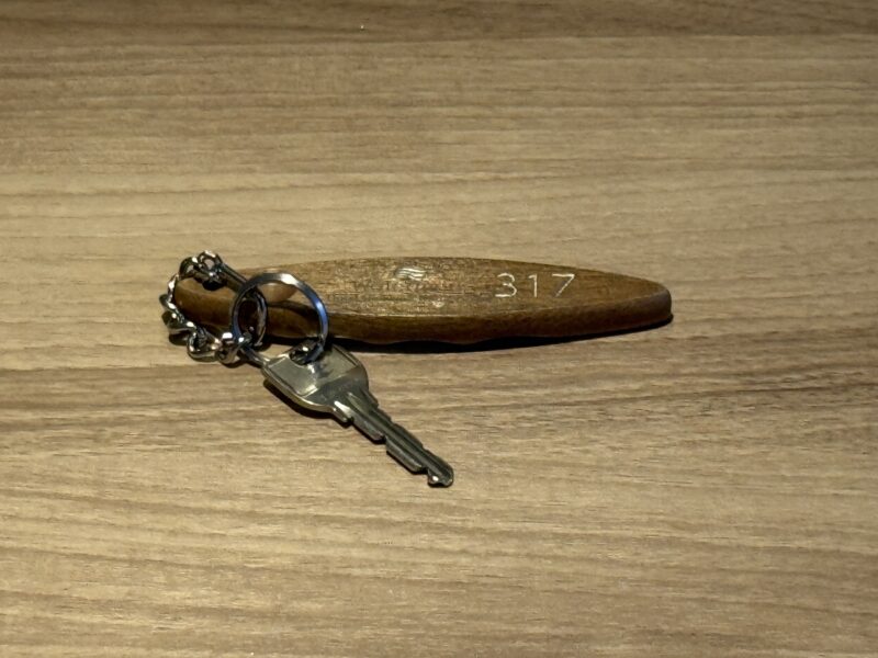 シンプルな金属キーながら、ナチュラルな木の質感がホテル全体の雰囲気とよく合っています。