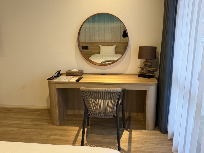 ミラーは丸型、自然素材を感じさせるランプも良いアクセントになっていて、ちょっとした作業や身支度にも使いやすい、落ち着いた空間でした。