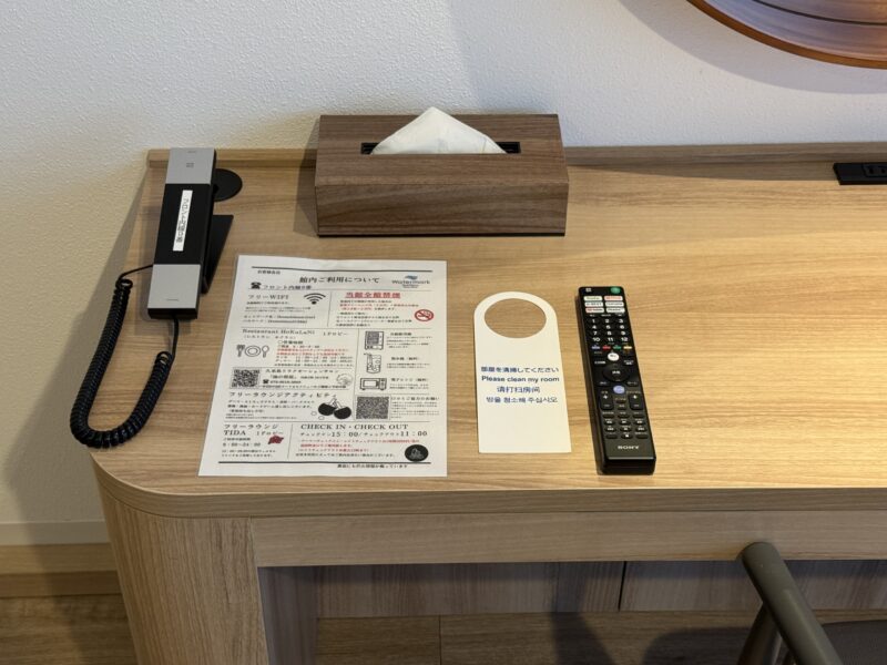 デスク上にはボックスティッシュ、電話、館内案内、テレビリモコン、客室清掃カードなどが整理されて配置されています。