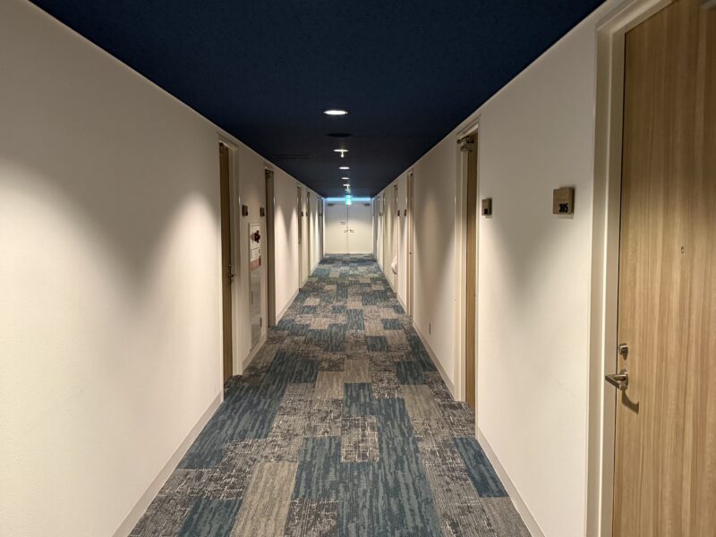客室フロアの廊下はすっきりとしたデザイン。ブルー系のカーペットが海を思わせる配色で、リゾートらしい雰囲気を感じます。