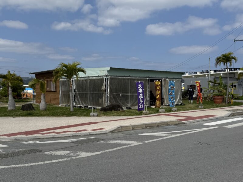 観光地らしすぎない、どこかゆるい雰囲気が久米島らしい一軒で、のぼり旗が並び、気取らない外観ながら、地元感たっぷり。
