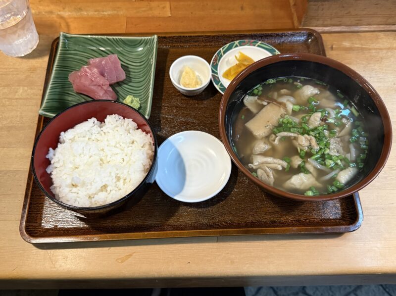 ご飯とお刺身、小鉢も付いた満足感のある定食。観光客向けというより、地元の味をそのまま楽しめる一品でした。